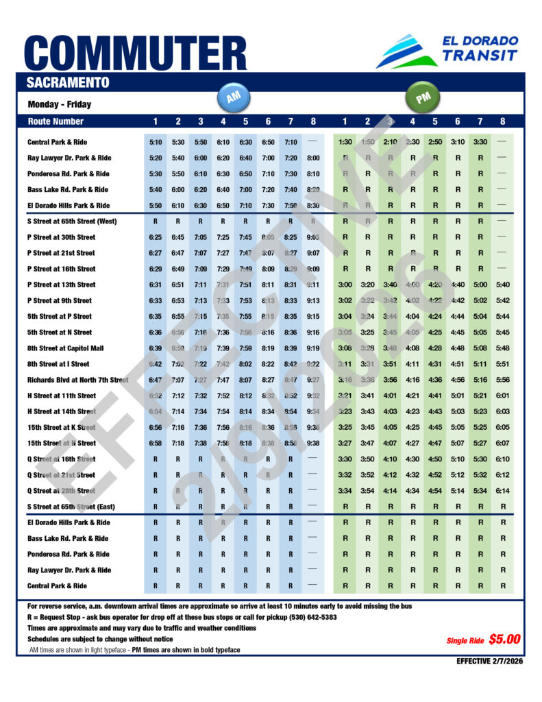 Effective Monday, February 9, 2026, El Dorado Transit will have service expansion for our Sacramento Commuter routes. There will be eight runs total for all AM and PM Commuters, Monday through Friday. Buses will now run in 20-minute intervals, except for the last AM and PM run, which will be 40 minutes.